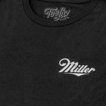 Take a deep dive into the timeless charm of America's most iconic beer with this comfortable graphic tee featuring the "Miller" text logo on the front left chest, and the Miller High Life "The Champagne of Beers" logo on the back. To complete the vintage look and feel of this Miller High Life shirt - we've distressed the graphic and printed it on a soft, black cotton tee.