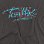 Charcoal gray T-shirt with a retro Teen Wolf logo in light blue and red, inspired by the 1985 Michael J. Fox movie.