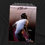 Black t-shirt with 1984 Footloose movie poster featuring Kevin Bacon dancing and the tagline “The music is on his side.”