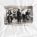 White t-shirt featuring a black-and-white image of The Breakfast Club cast sitting in the school library during detention, with the movie title below.