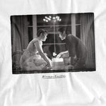 White t-shirt with a black-and-white image of Samantha and Jake from Sixteen Candles leaning over a birthday cake, with the movie title written below.