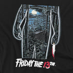 Black t-shirt with 'Friday the 13th' graphic design featuring hands holding a cabin in the woods.