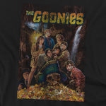Black t-shirt with 'The Goonies' movie poster design featuring the group and iconic text.