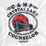 White t-shirt with 'Camp Crystal Lake Counselor' design featuring a cabin and moon.