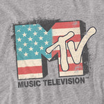 Gray t-shirt with MTV logo and American flag design on a white background
