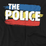 Black t-shirt with The Police logo in distressed white letters over horizontal blue, yellow, and red brushstroke stripes.