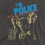 Dark gray t-shirt featuring a distressed yellow print of The Police band members with “The Police” in bold blue text above and red Japanese katakana spelling “Walking on the Moon.”