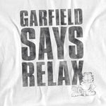 White t-shirt with large black text that reads “Garfield Says Relax” and a small graphic of Garfield reclining in a chair at the bottom.