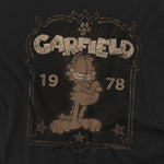 Black Garfield t-shirt with a distressed sepia design featuring Garfield standing with folded arms, the word “Garfield,” and the year “1978.”