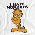 White t-shirt featuring Garfield with arms crossed and the phrase “I Hate Mondays” in bold black text above.
