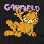 Black t-shirt featuring Garfield lying down with a laid-back wave, the word “Garfield” printed above in purple retro lettering.