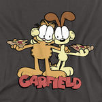 Charcoal gray t-shirt featuring Garfield and Odie standing together, each holding a slice of pizza, with the Garfield logo underneath.