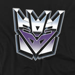 Black t-shirt featuring the metallic purple-and-silver Transformers Decepticon logo centered on the chest.