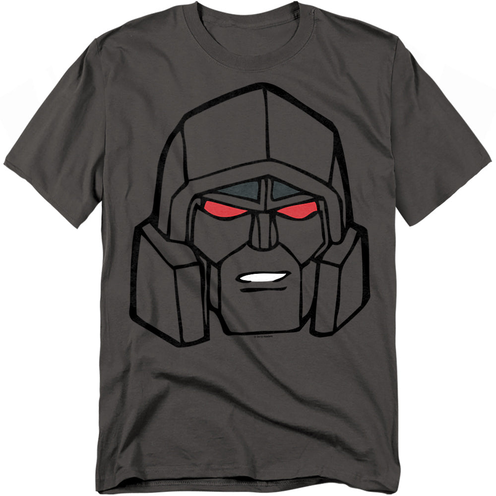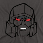Charcoal gray t-shirt featuring a large cartoon-style close-up of Megatron’s face with red eyes and black outlines in G1 Transformers design.