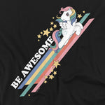 Black t-shirt featuring a vintage My Little Pony Pegasus flying with a rainbow trail and stars, alongside the words “Be Awesome.”