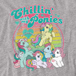 Heather gray t-shirt with a rainbow backdrop and six colorful vintage My Little Pony characters beneath the phrase “Chillin’ with My Ponies.”
