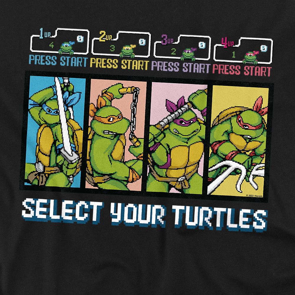This black tee captures that exact moment of anticipation: the character select screen. Leonardo, Michelangelo, Donatello, and Raphael stand ready for battle, each framed in their 8-bit glory. The bold “Select Your Turtles” text takes you right back to slapping down tokens and yelling “I got Donnie!” before Player 2 could steal him.