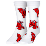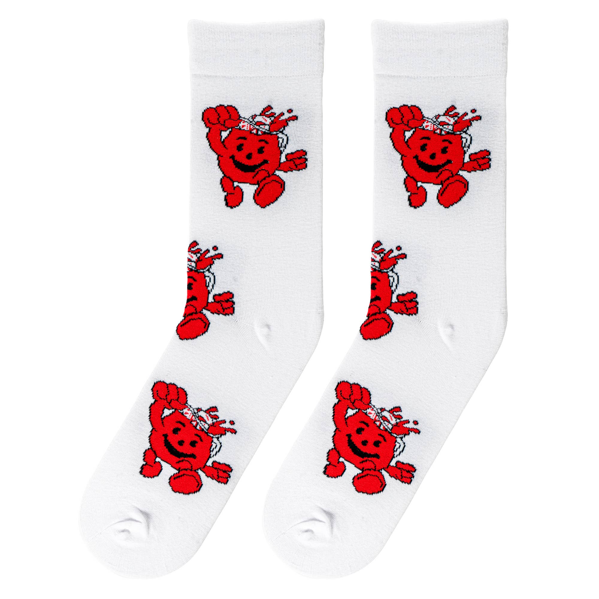 Oh yeah! Add a splash of nostalgia to your wardrobe with these retro Kool-Aid Man Socks! A throwback to carefree days when your mom made a pitcher of your favorite Kool-Aid flavor in an orange Tupperware pitcher. Perfect for sipping an ice-cold glass of PurpleSaurus Rex!