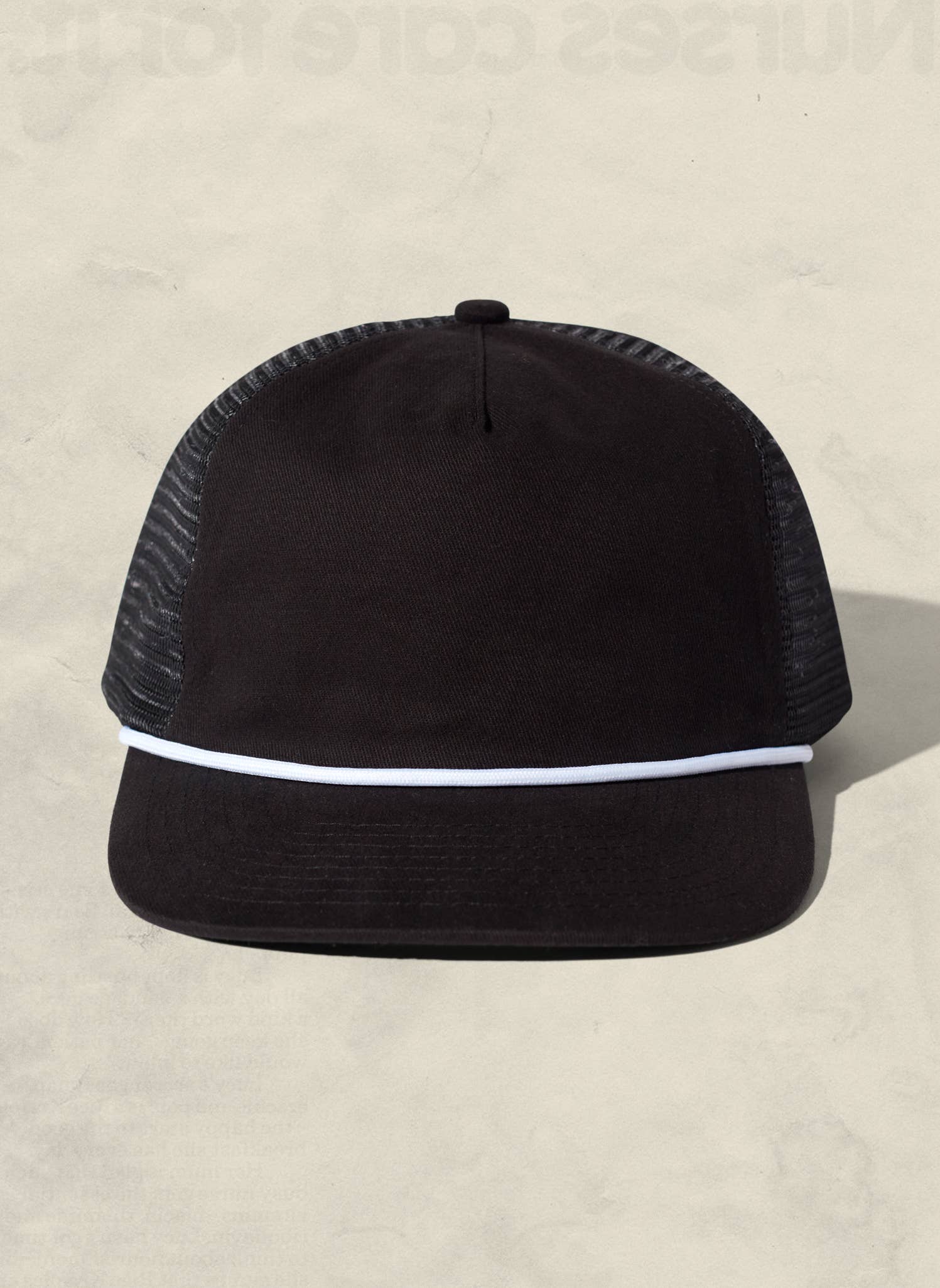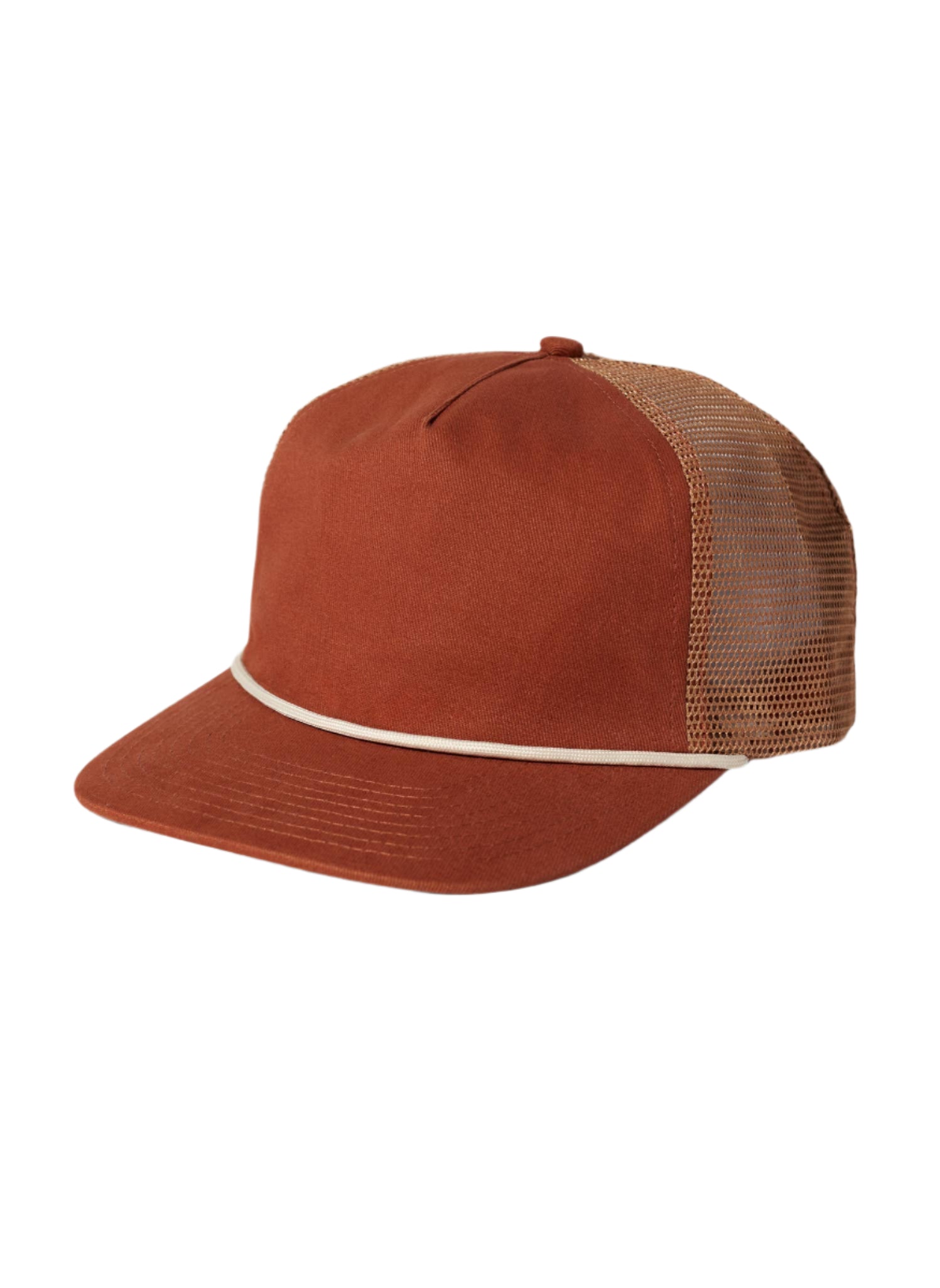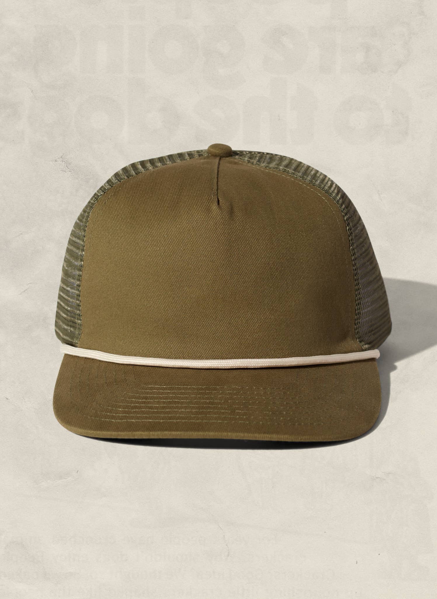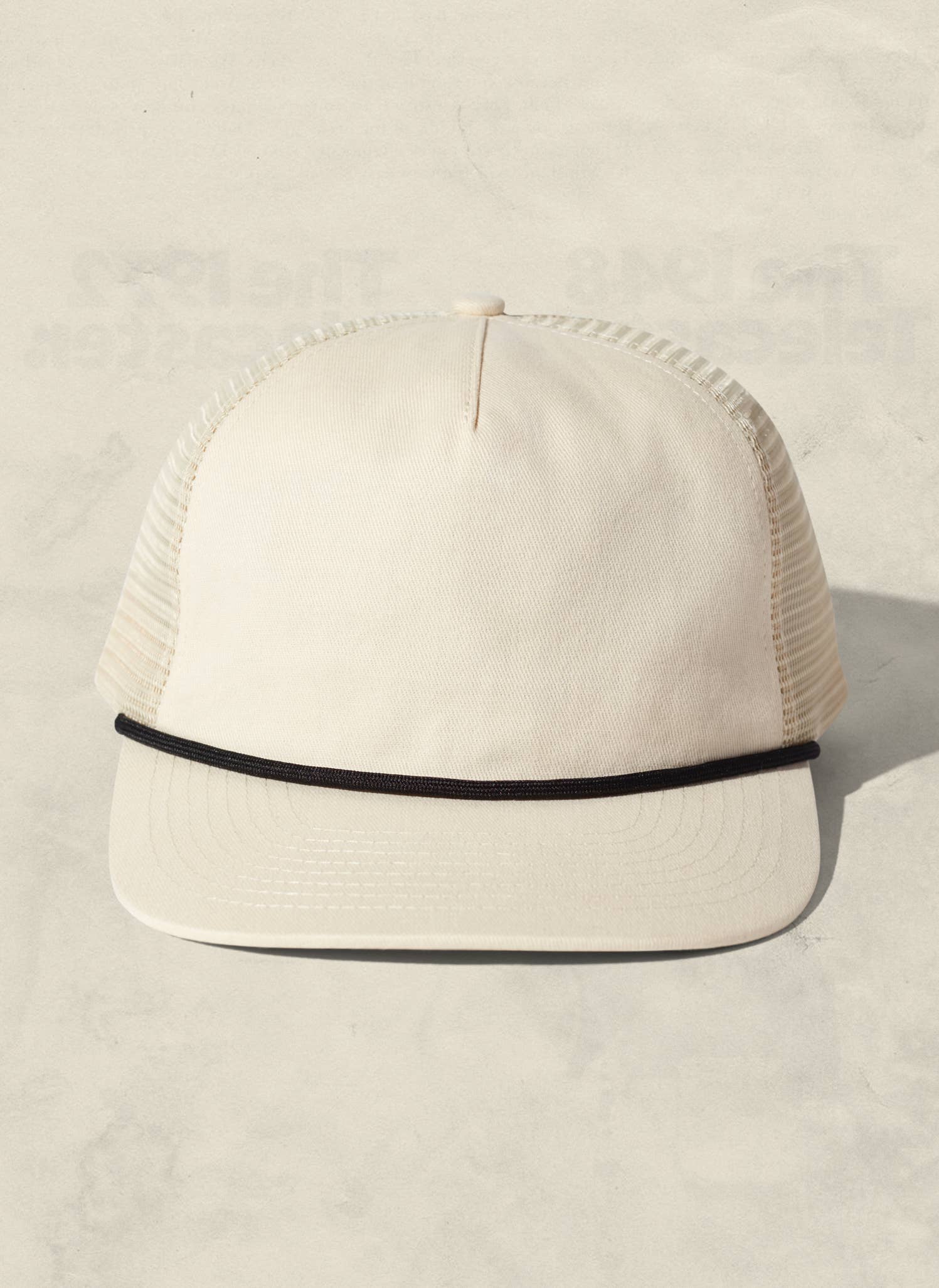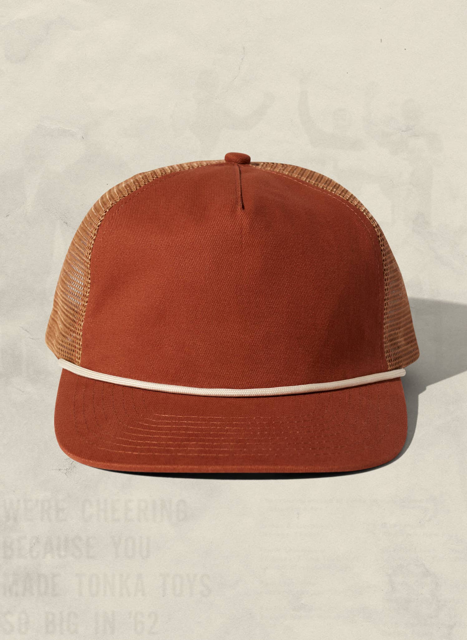 5-panel trucker hat. There is a mesh liner behind the front panels to help maintain shape of the soft 100% cotton fabric. The brim is the same size but has a slight curve and features a rope. Its build is derived from our nostalgia for vintage workwear hats. The timeless hats have a plastic snapback closure. 100% Cotton Fabric Snapback Closure. Slight Curved Brim with rope. Our original fit. One size fits most. Imported.
