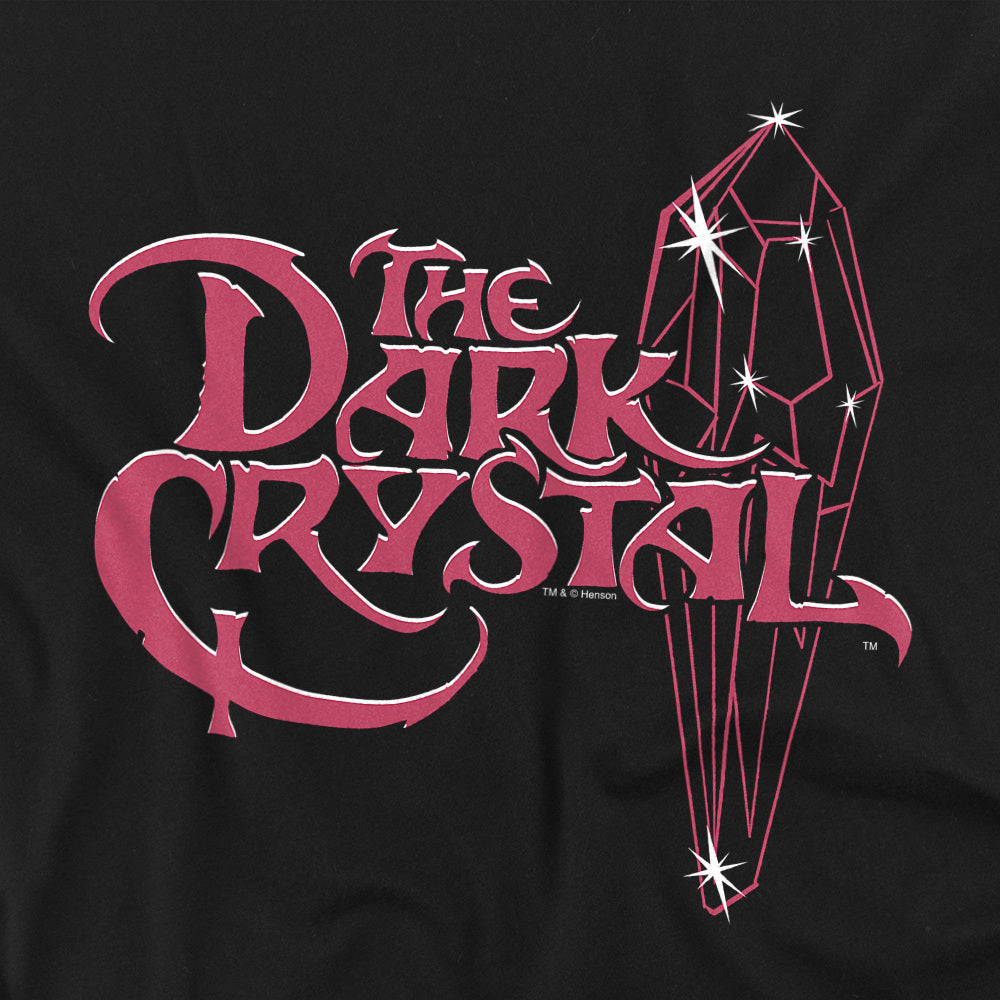 Black The Dark Crystal T-shirt featuring the movie’s iconic magenta logo beside the crystal shard, rendered in a sparkling, mystical design that captures the fantasy aesthetic of Jim Henson’s 1982 classic.