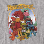 Heather gray t-shirt featuring Gobo, Red, Wembley, Mokey, and Boober from Fraggle Rock in a colorful oval design with the Fraggle Rock logo.