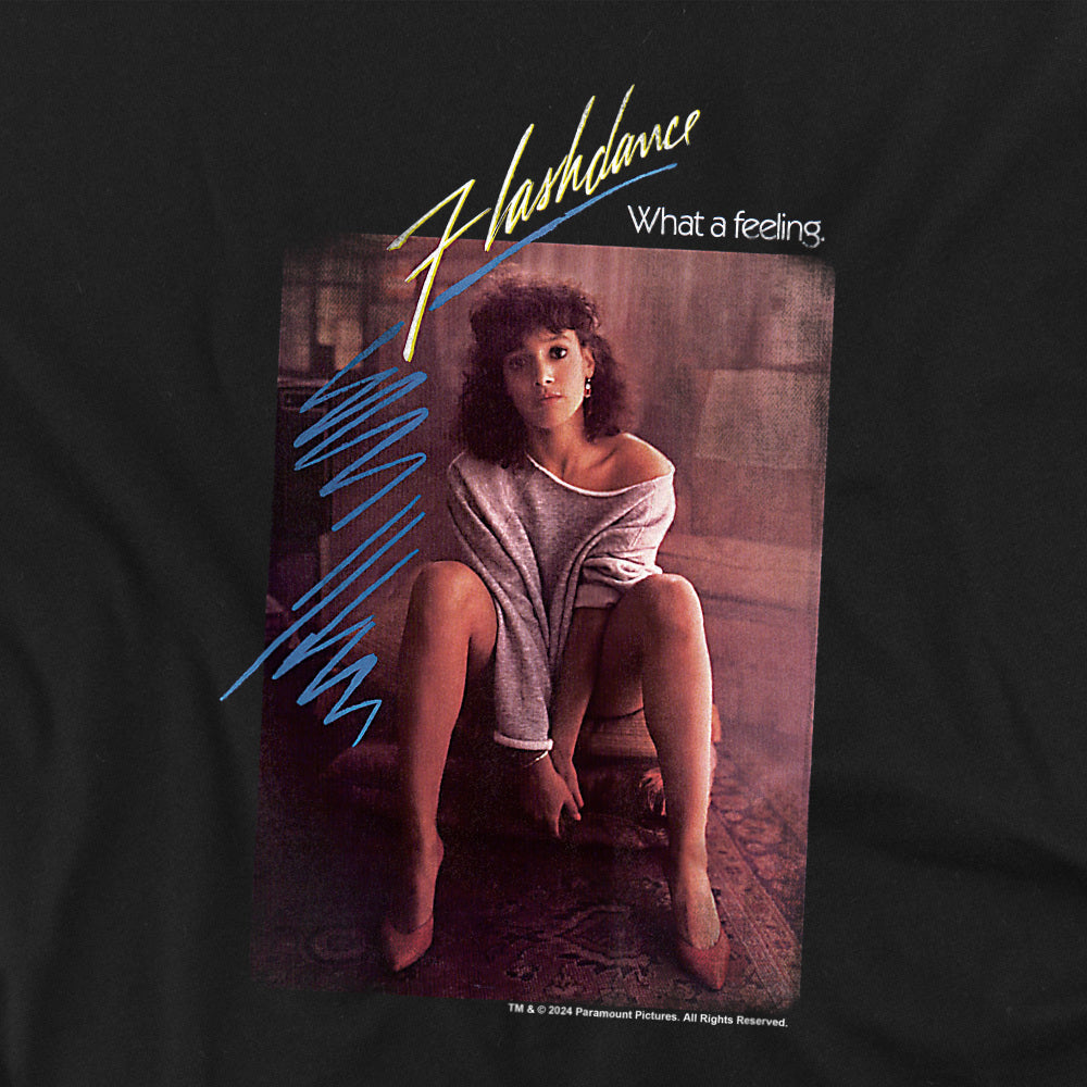 Black t-shirt with a Flashdance movie poster graphic of Jennifer Beals sitting in her off-the-shoulder sweatshirt with “Flashdance What a Feeling” text.