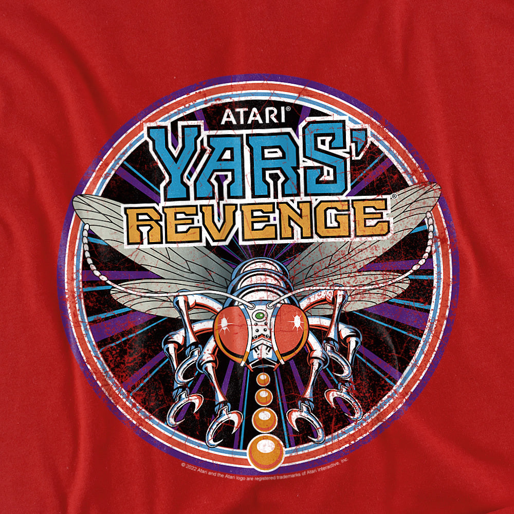 Bright red t-shirt featuring retro Atari Yars’ Revenge artwork, with a robotic insect design in bold detail inside a circular cosmic frame with the title above.