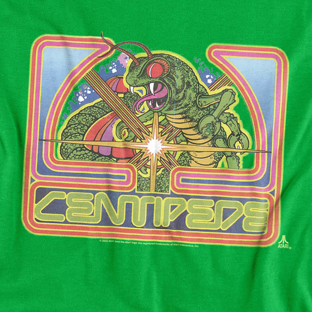 A bright green t-shirt featuring retro artwork from Atari’s arcade classic Centipede, with a colorful illustration of a giant centipede being zapped by a laser, surrounded by mushrooms and neon-style text.
