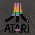 A charcoal gray t-shirt with the Atari logo filled with stacked colorful block patterns, based on the classic Atari game Breakout. The word "ATARI" is printed below in bold black letters, with block colors integrated into the text.