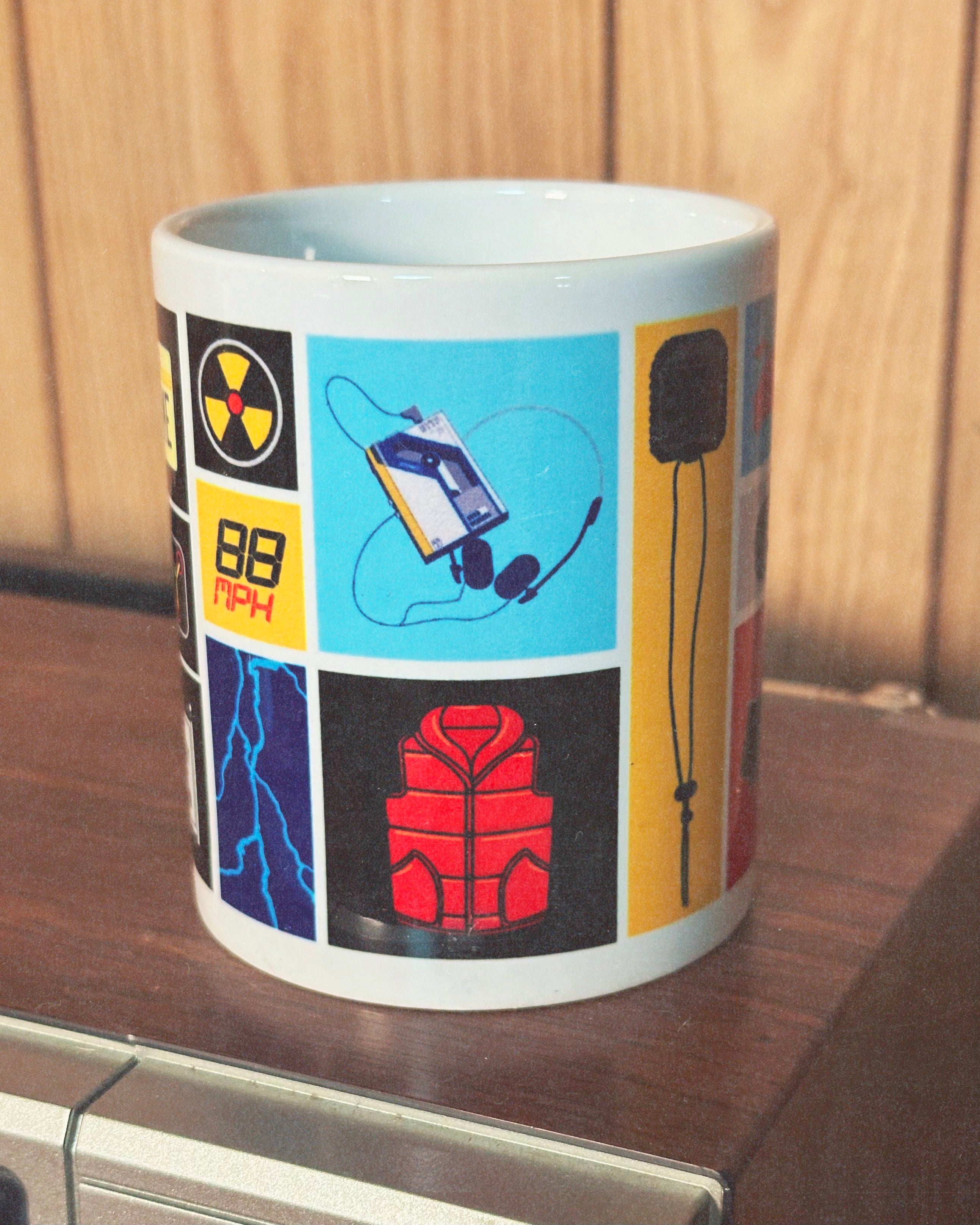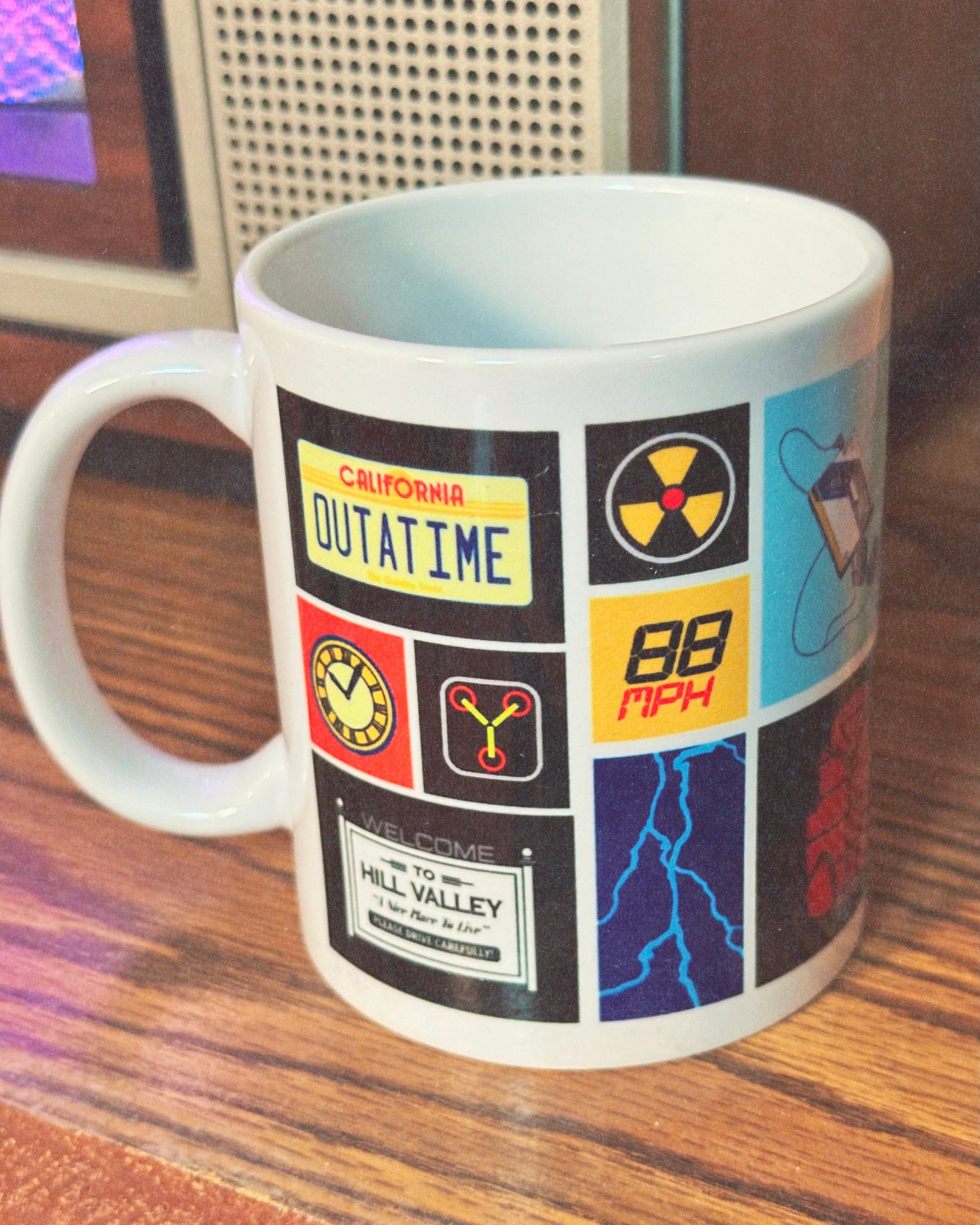 Officially licensed Back to the Future coffee mug featuring a collection of iconic items from the movie