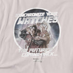 Great Scott! This Back to the Future Part II tee captures the heart of the trilogy with Marty and Doc front and center. Featuring the tagline “Synchronize Your Watches – The Future’s Coming Back,” it channels the excitement and anticipation of time travel with vintage poster-style artwork. Printed on soft cotton, this shirt blends 80s nostalgia with everyday comfort, making it perfect for movie nights, conventions, or just showing your fandom loud and proud.