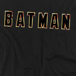 Black t-shirt with bold “BATMAN” block letters in gold and red, inspired by the 1989 film.