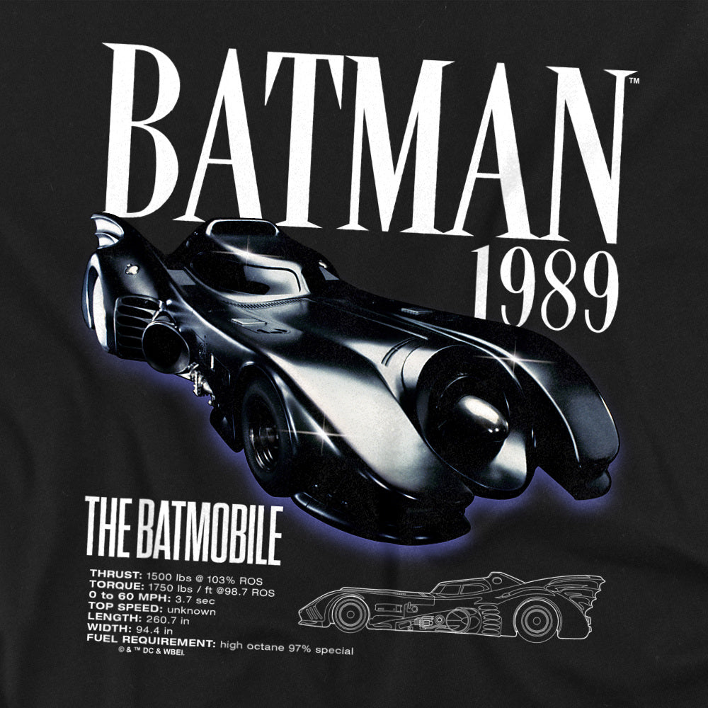Black t-shirt featuring the 1989 Batman Batmobile with technical specifications and blueprint artwork.