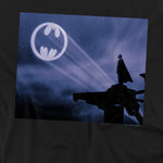 Black t-shirt featuring Batman standing on a rooftop with the Bat-Signal shining in the sky, inspired by the 1989 film.