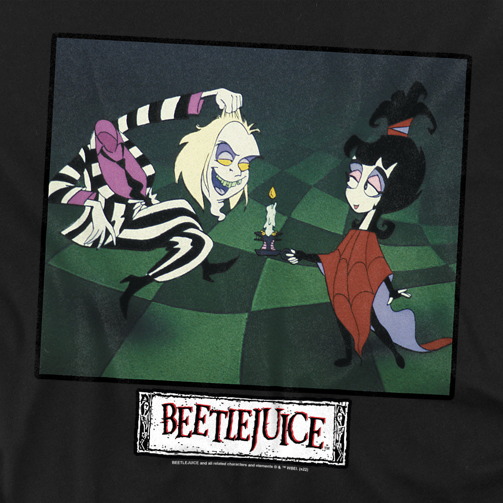 A black t-shirt featuring a colorful print from the Beetlejuice animated series. The artwork shows Beetlejuice crouched playfully in his black-and-white striped suit, grinning at Lydia Deetz. Lydia, wearing her red spiderweb poncho, holds a lit candle while giving a sly smile. The Beetlejuice logo appears below the image in a distressed white box with red lettering.