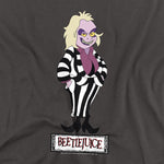 A charcoal gray t-shirt featuring a cartoon version of Beetlejuice from the animated series. He is drawn with pale purple skin, yellow eyes, and messy blonde hair. Beetlejuice wears his iconic black and white striped suit with a purple shirt and red tie, standing confidently with his hands in his pockets. Below him is the word "Beetlejuice" in a distressed black and red logo.