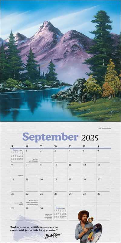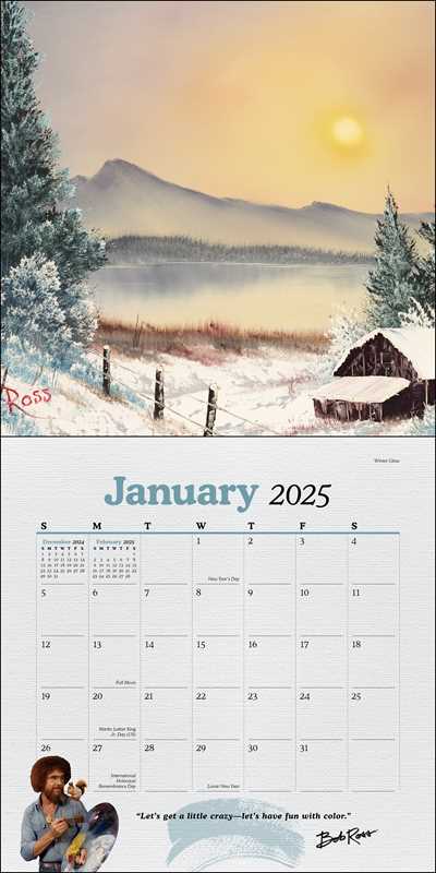 A celebration of America's most beloved and iconic art instructor, Bob Ross. Add serenity and inspiration to your walls in 2025, with this yearlong wall calendar that features the paintings and charm of Bob Ross. This official Bob Ross™ 2025 Wall Calendar features 12 of Bob Ross's signature landscapes and a bonus poster—complete with happy little clouds, friendly trees, and inspiring quotes. Share the joy of painting and Bob Ross's colorful world of “happy accidents.” - Features inspirational quotes from Bob Ross and iconic paintings - Includes poster! - Bonus spread for September-December 2024 - Generous grids for adding appointments and reminders - Includes major official world holidays - Opens to 12 inches x 24 inches