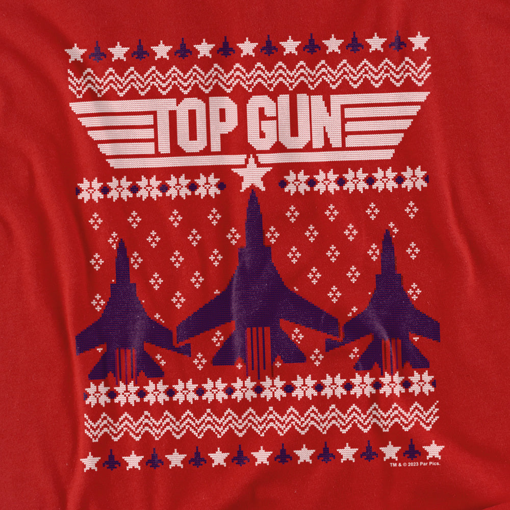 Red t-shirt featuring a knit-style Top Gun design with fighter jets, stars, and holiday sweater patterns.