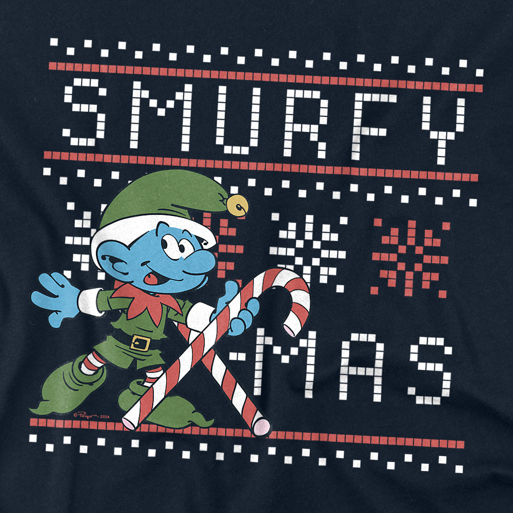 Step into a bright and cheerful holiday season with this officially licensed Smurfs “Smurfy Xmas” t-shirt. Printed on a deep navy tee, the design features an adorable Smurf dressed as a Christmas elf, proudly holding a giant candy cane. Surrounding the artwork is a playful 8-bit sweater pattern made of snowflakes, stripes, and pixel-style lettering that reads “Smurfy Xmas.” The vintage cartoon colors and retro knit aesthetic blend together perfectly for that classic 80s holiday charm.