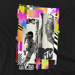 Black t-shirt with colorful graphic design featuring 'MTV' on a white background