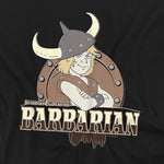 Black t-shirt featuring Bobby the Barbarian from the 1980s Dungeons & Dragons cartoon, with arms crossed and wearing his horned helmet, framed by a round shield and bold “Barbarian” text.