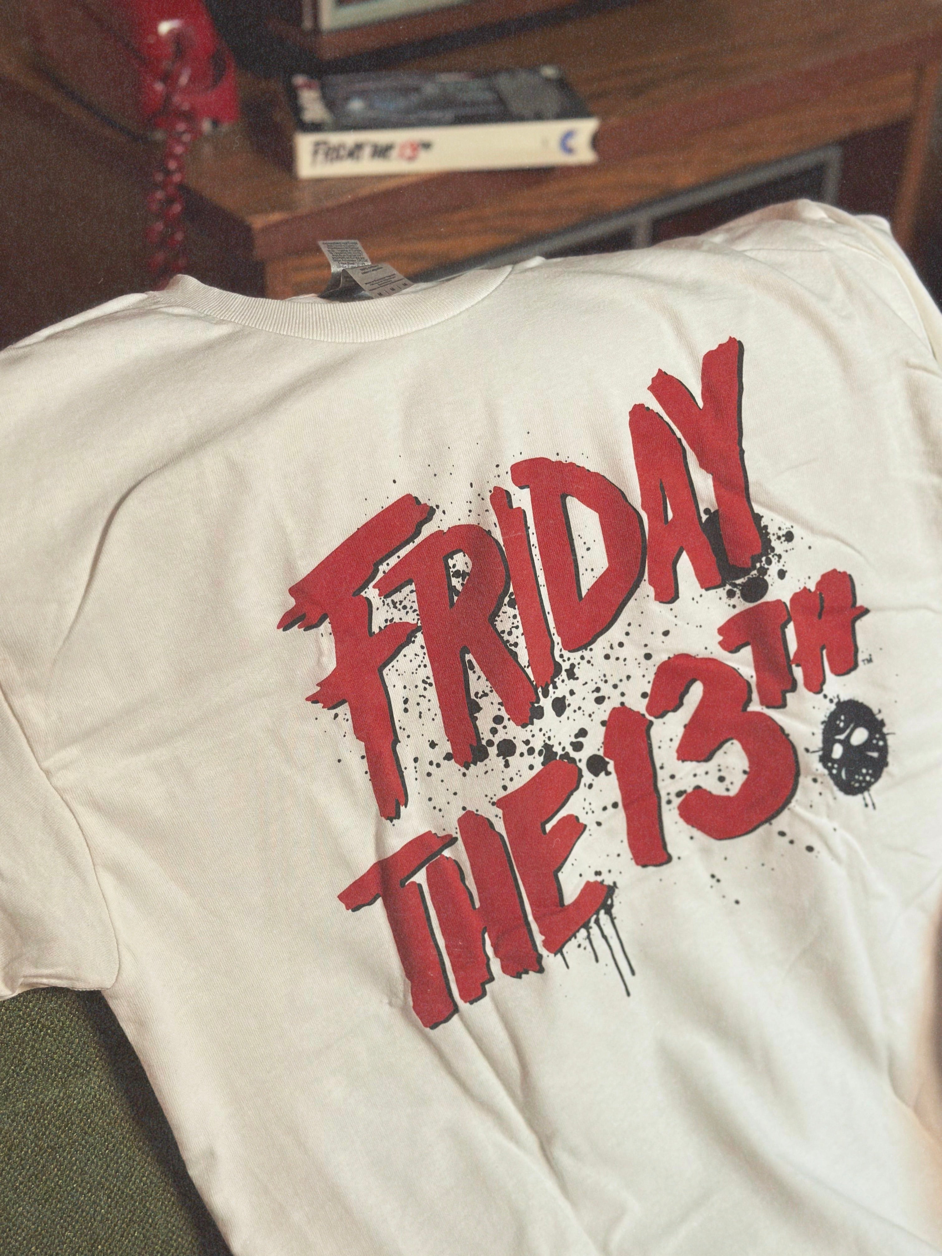Featuring the iconic Friday the 13th logo and Jason's mask, this shirt is perfect for fans of 80s horror!