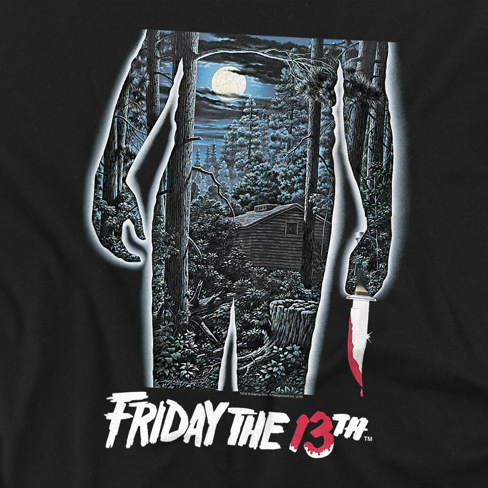 Black t-shirt with 'Friday the 13th' graphic design featuring hands holding a cabin in the woods.