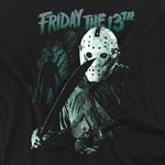 Black t-shirt with 'Friday the 13th' graphic design featuring a masked character holding an axe.