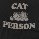 Black Garfield t-shirt with the phrase “Cat Person” and a graphic of Garfield lying down in a relaxed pose.