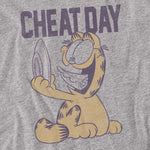 Heather gray t-shirt with Garfield holding food happily, with the bold text “Cheat Day.”