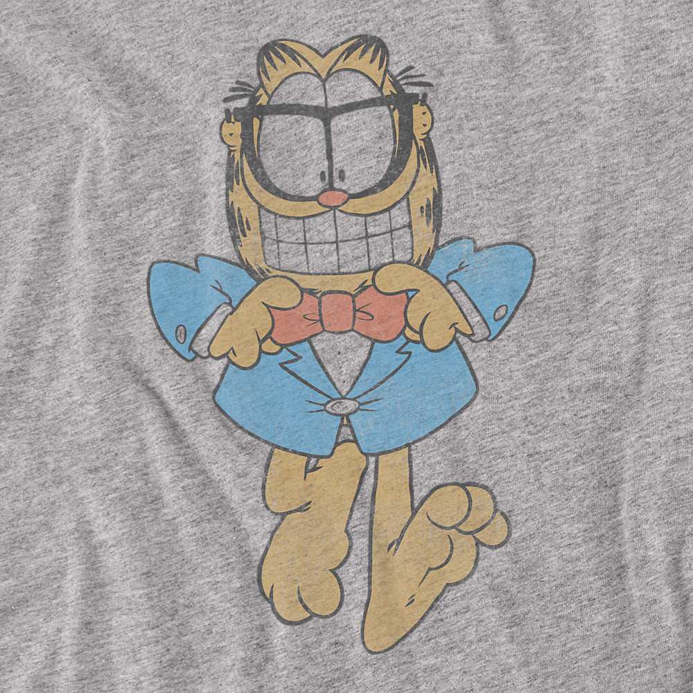Gray t-shirt featuring Garfield wearing glasses, a blue suit, and a red bow tie with a big grin.