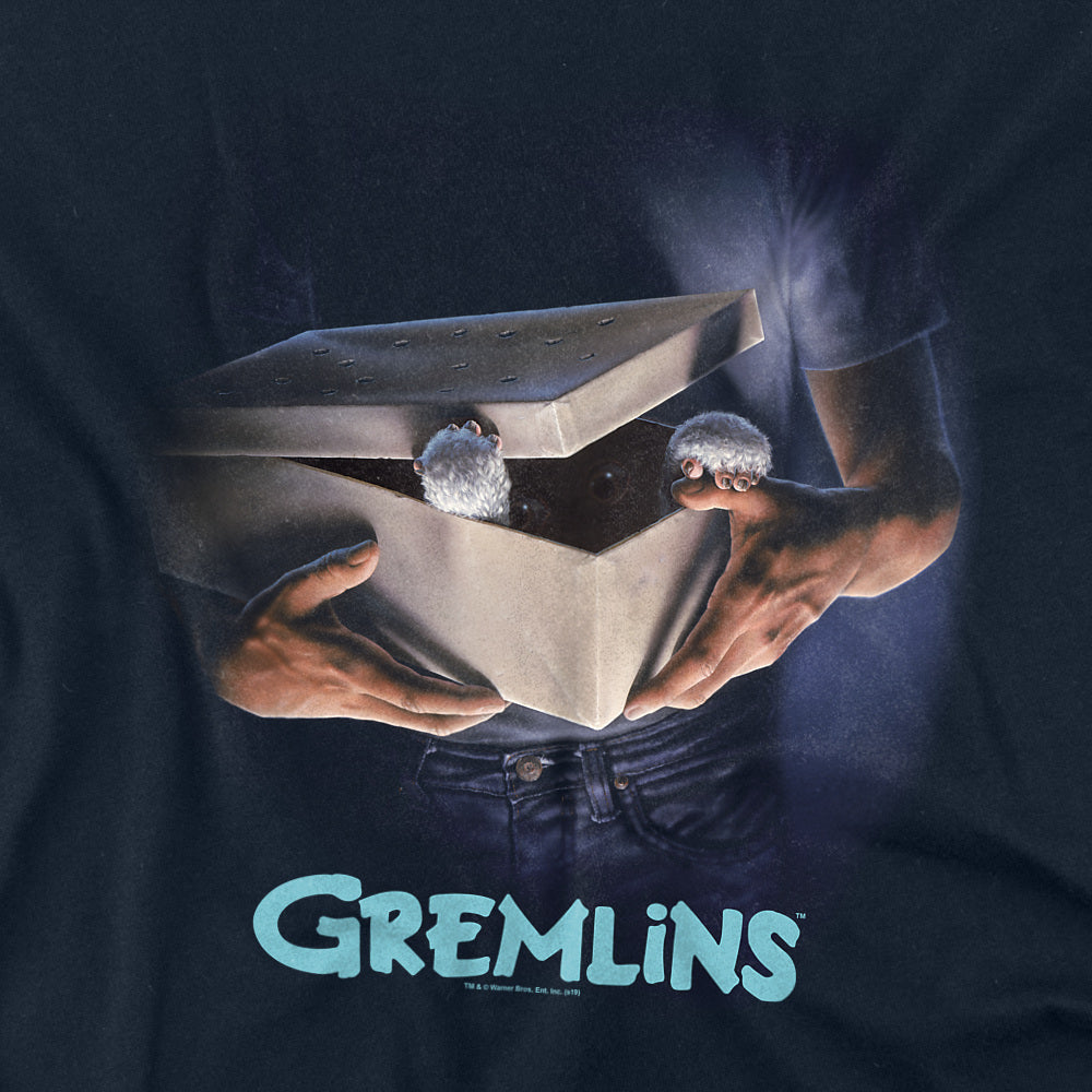 Before you knew the rules, you only saw the box — and what was inside was a mystery. This shirt brings back the original Gremlins poster art, showing Gizmo’s tiny paws peeking out from the gift box that started it all. It’s subtle, eerie, and instantly recognizable to fans of Joe Dante’s 1984 classic.