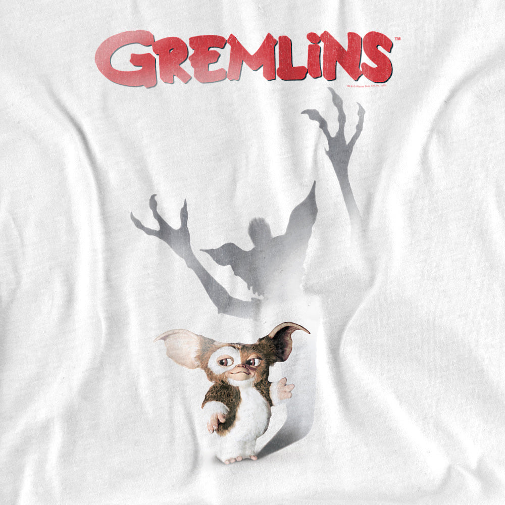 White t-shirt with 'Gremlins' logo and Gizmo the mogwai on a white background