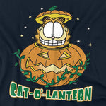 Black t-shirt featuring Garfield inside a carved jack-o-lantern with the caption “Cat-O-Lantern” in bold green and orange lettering.